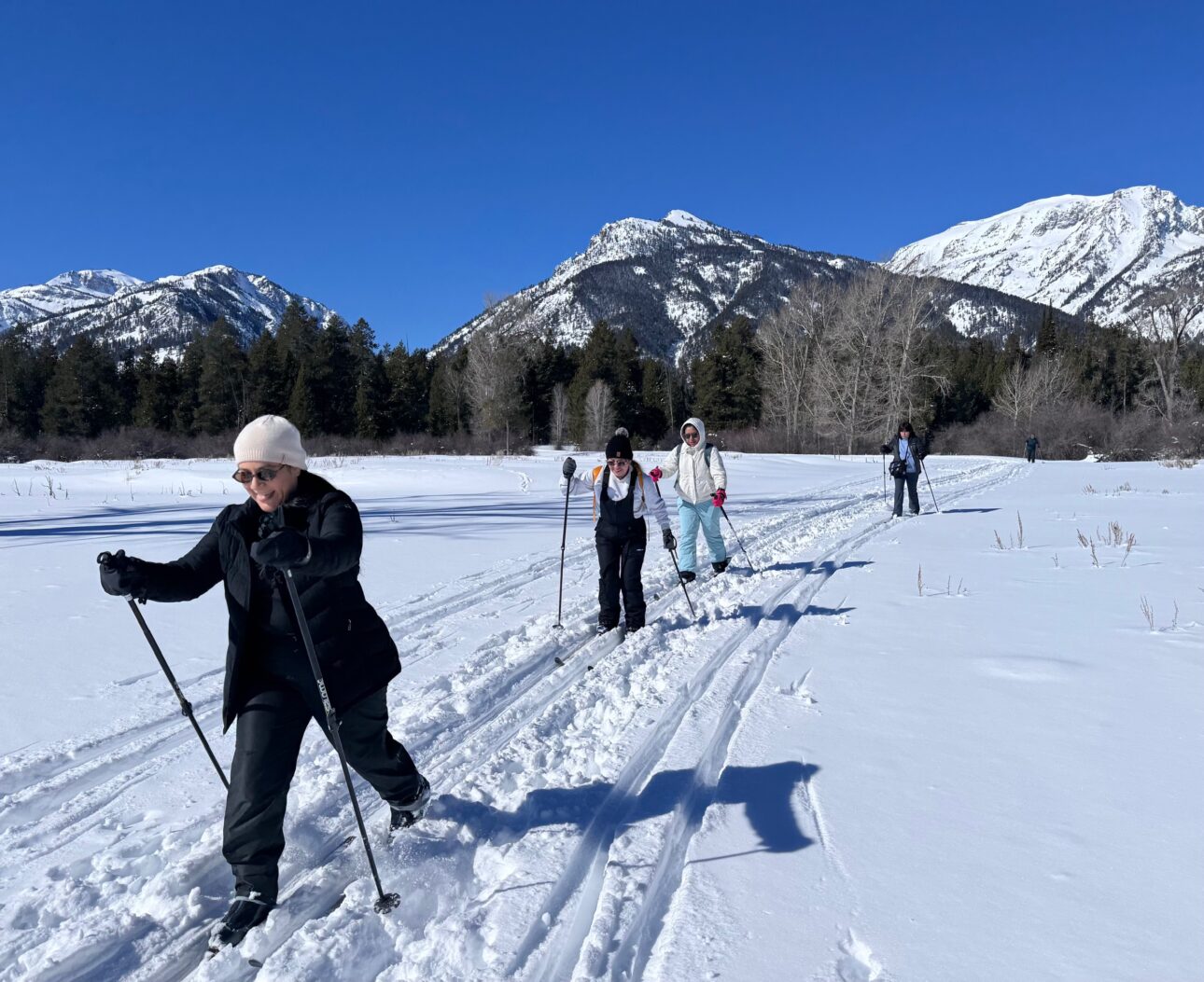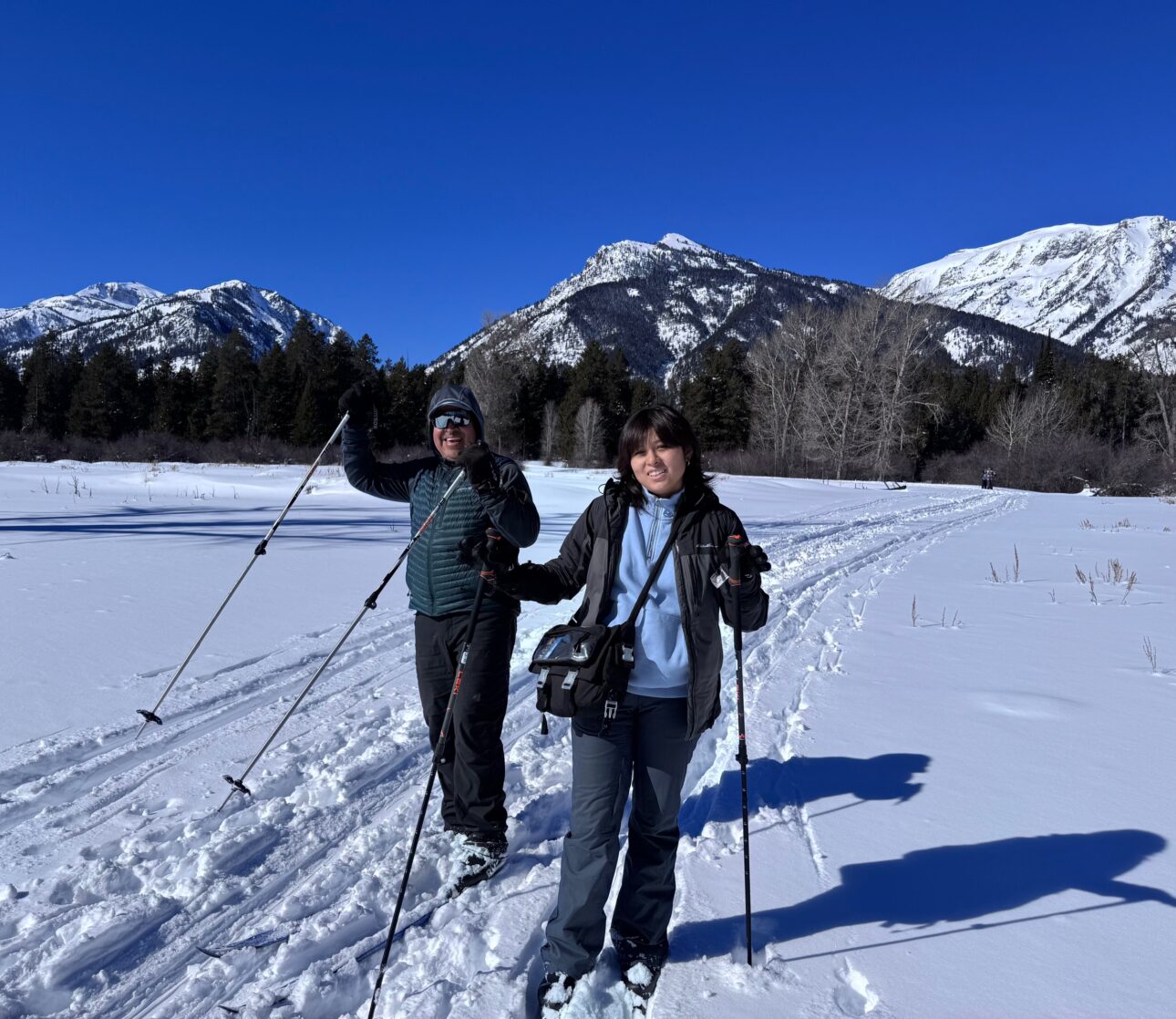 Camina Conmigo, the Jackson Hole outdoor recreation group lead by Miriam Morillon and her husband Roney de la Cruz, explored the skier tracked trails of South Grand Teton National Park on Sunday afternoon. Our group of Nordic skiers, some experienced, some first timers, explored the Moose-Wilson road out to LSR on a beautiful, sunny, windless day. Miriam led some warm-up exercises on the trail to get everyone set to ski and have fun. A JH Nordic Alliance volunteer shared tips, tricks and trail etiquette while enjoying the ski with the group, including how to follow along on the map on the jhnordic.com gps map on a phone. We skied out along the Moose-Wilson road and returned by the mile-long meadow, east of the outbound trail.