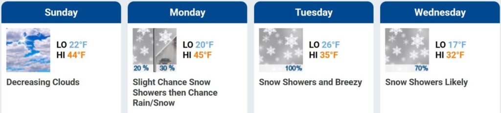 Mountain Weather is forecasting warm weather today and tomorrow followed by a return of precipitation this week. Get out and enjoy the wintery weather!