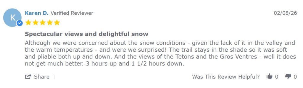 Karen D. reviewed the Signal Mountain trailon Sunday, February 8 and was happily surprised with the current conditions. Leaving a review is a great way to share your adventure with the JH Nordic community.