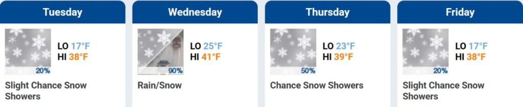 Mountain Weather is forecasting chances of snow showers through the week with warm day time temps and cooler overnight lows.