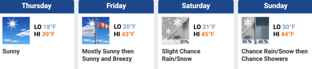Thursday and Friday look like blue skies and well below freezing nights. See the full Mountain Weather forecast.