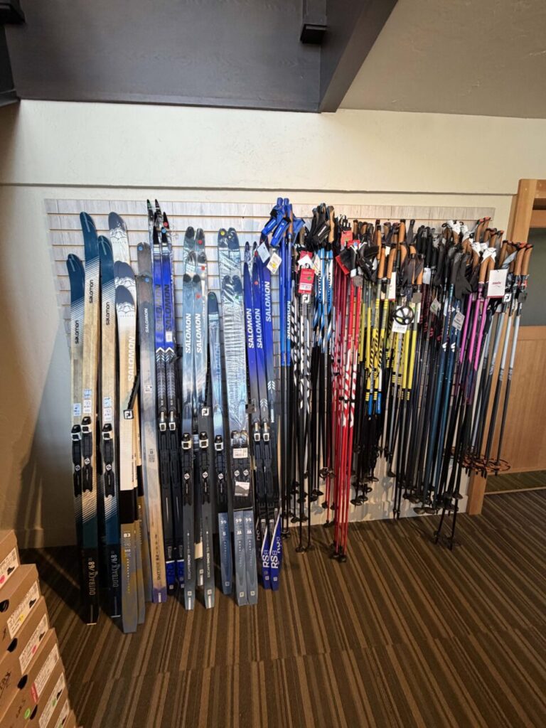 And if fast fun tracks are not enough to entice you to Teton Pines for a ski, Cody has lots of closeout skis and boots at 50% off! They are selling their demo / rental gear: skate, classic, and metal-edged backcountry touring. Most sizes are still available. Beware: it could be hard to pass up some of the new fun retail gear when you are in looking for great used rental and demo skis.
