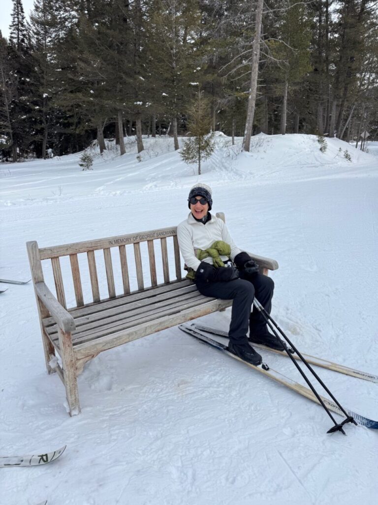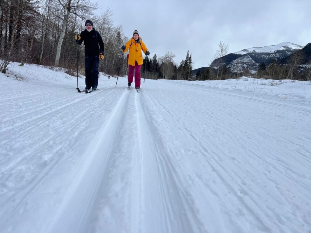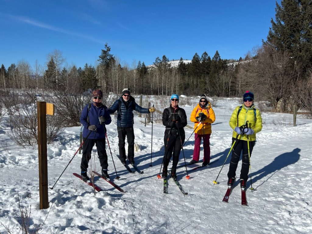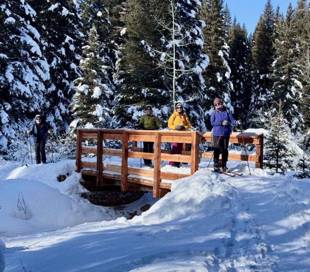 Our adventure to Teton Canyon started with a route new to all of us! We began at the Teton Canyon parking lot but immediately headed south across a lovely bridge and followed the not-groomed ski/boot/fat tire bike tracks for around two miles of trail that paralleled the main canyon road. Once back at the groomed track, we joined many others for a joyous ski out and back.