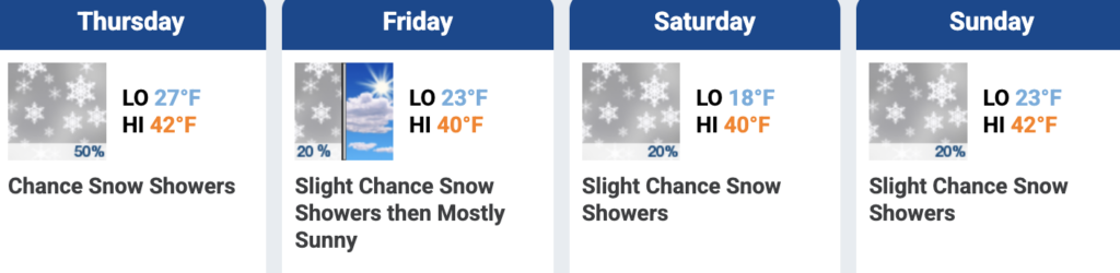 Mountain Weather is forecasting mixed snow showers and warmish temps. Prepare for potentially sticky snow and wet layers on adventures leading into the weekend. Overnight temps look great!